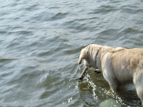 Mój goldek podobnie jak kes, zaczynał od rzucanego patyka. Ares wyglądał na zdziwionego faktem, że mimo iż skończył mu się grunt pod nogami nadal się zbliżał do patyka. Jak wyszedł z wody był bardzo podekscytowany. Później spodobało mu się brodzenie w trzcinach. Tylko czekałem aż jakiegoś szczupaka przytaszczy... Ciekawe jak by mu szło nurkowanie? Nos zanurza w wodzie jak kaczka, co mnie zdziwiło, bo kiedyś miałem kundelka i mimo, że też lubił wodę, to jednak był ostrożniejszy.